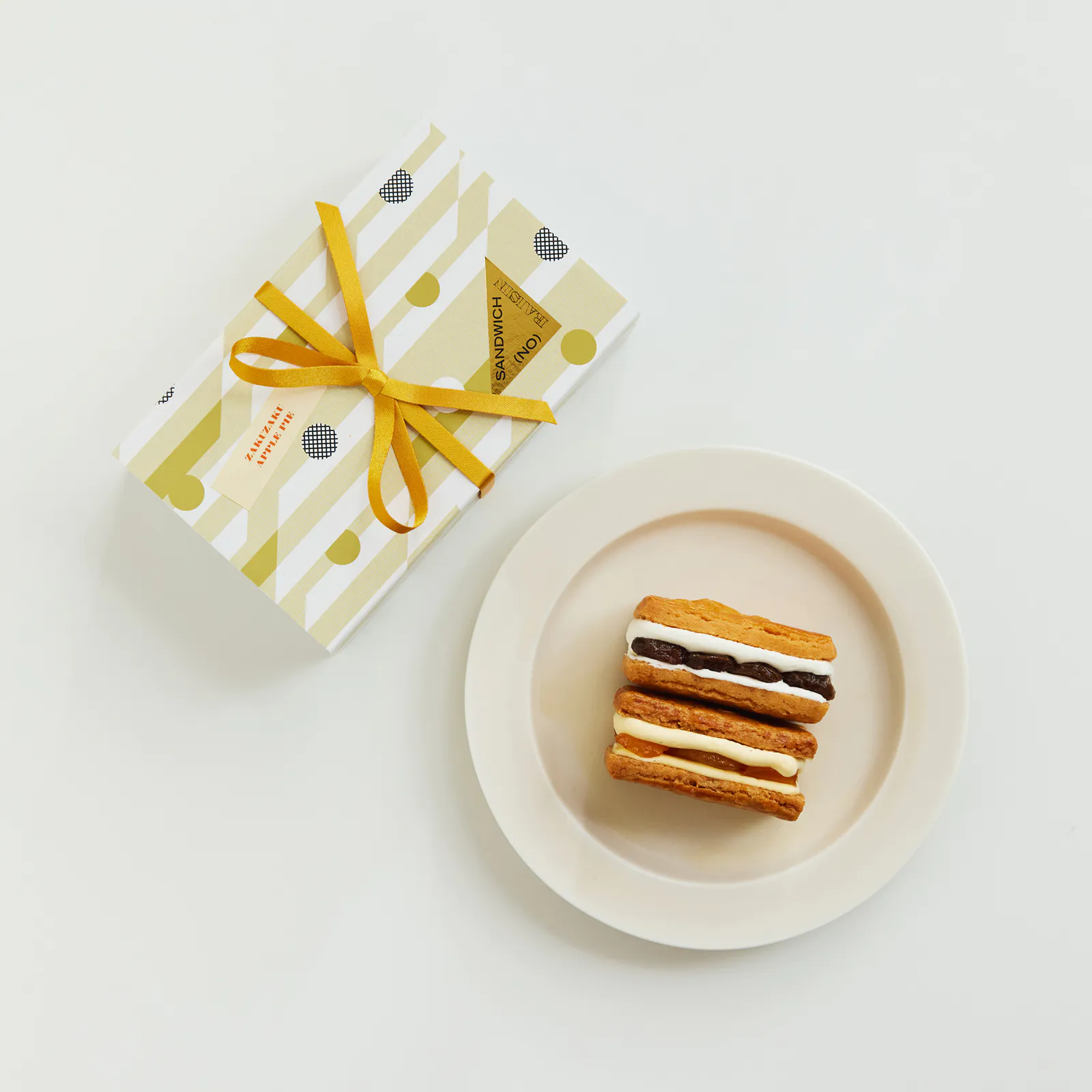 ザクっとした生地、シャキッとした林檎の鮮やかさ、爽やかな後味のクリーム。そんなアップルパイへの理想を詰め込んだバターサンド。シナモンやクローブの秋らしい香り漂わせるサブレは、フィヤンティーヌを混ぜ込むことでザクザクなパイを表現。カスタードとサワークリームを加えたバタークリームと、キャラメルでコンポートした林檎を香ばしいピーカンナッツと一緒に挟みました。アップルパイを頬張る多幸感をギュッと閉じ込めたフレーバー。