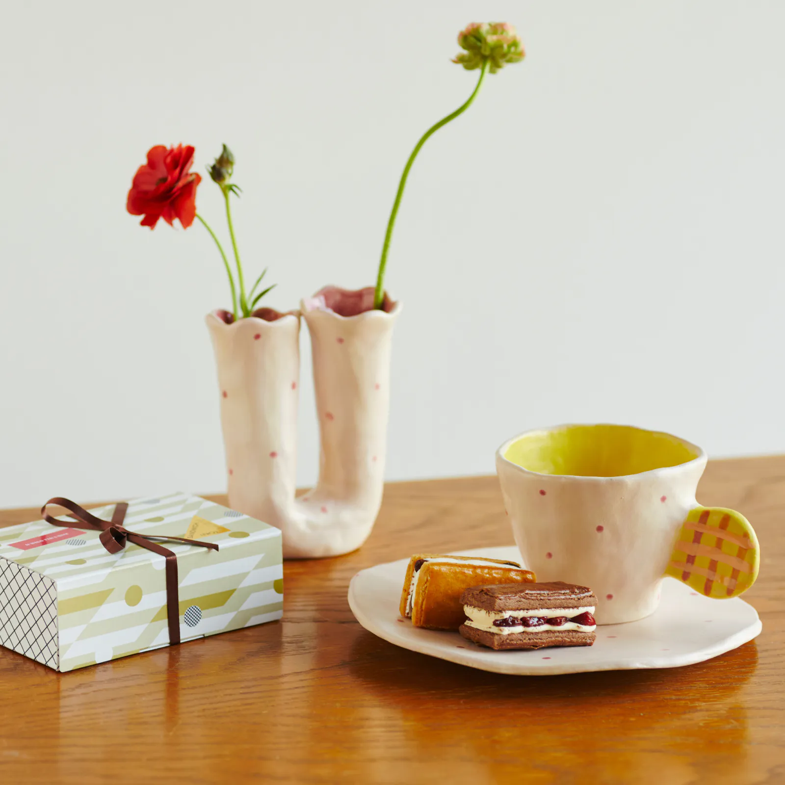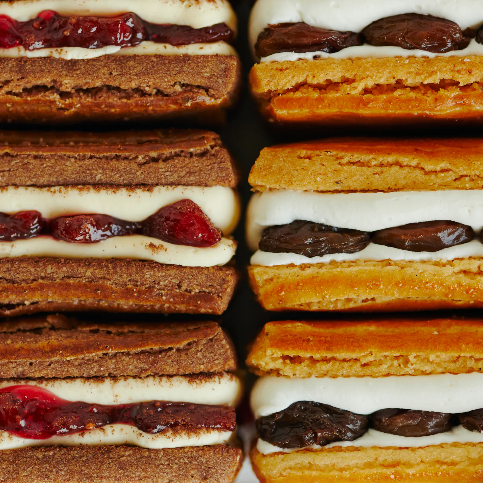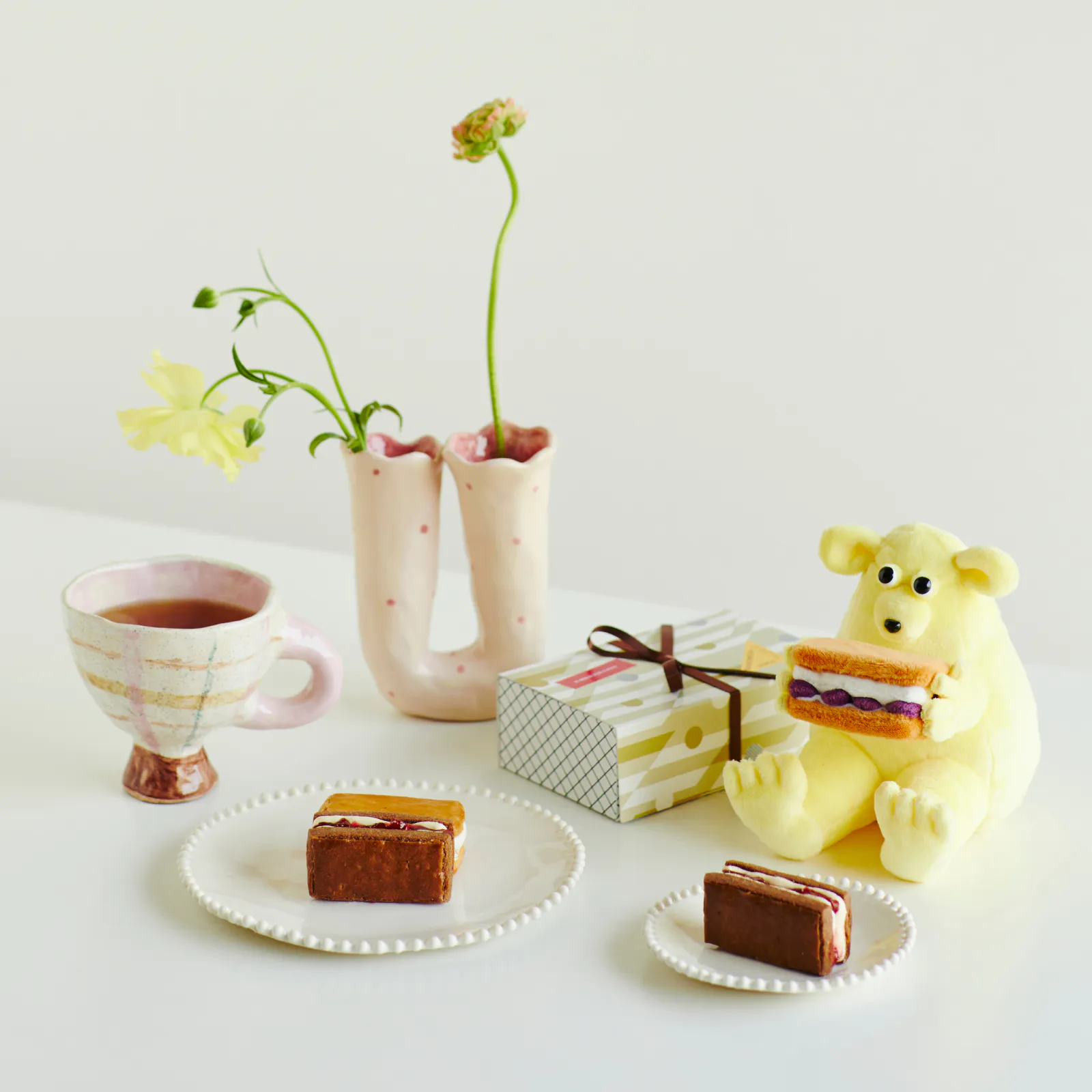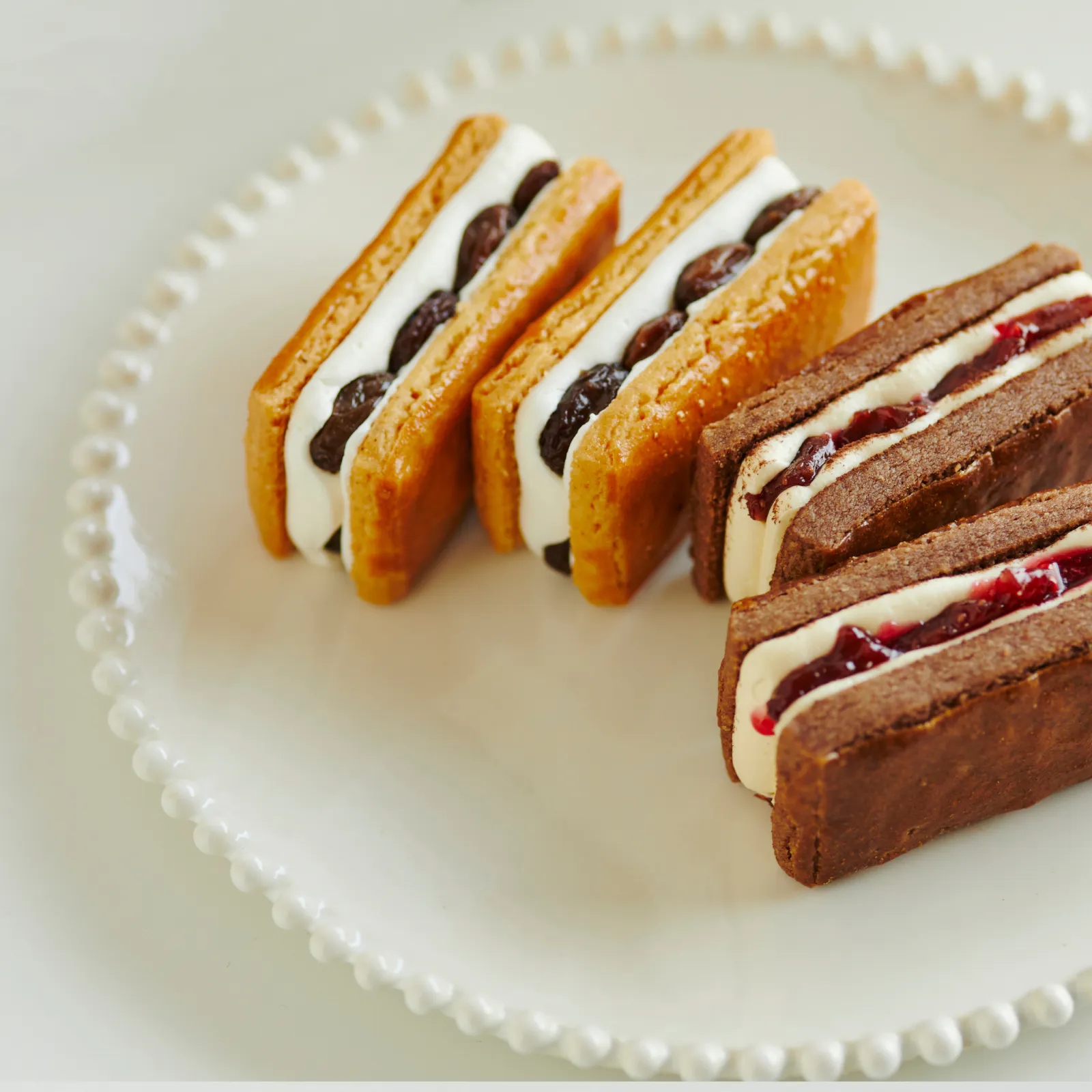 ティラミスのバターサンドを食べてみたい。そんな願いが形になりました。マスカルポーネ入りのバタークリームに輝くいちごの赤。いちごのコンポートに甘酸っぱい木いちごの自家製ジャムが寄り添い、カカオとエスプレッソの香ばしいサブレでサンド。口の中でティラミスが広がるスイートな春味です。