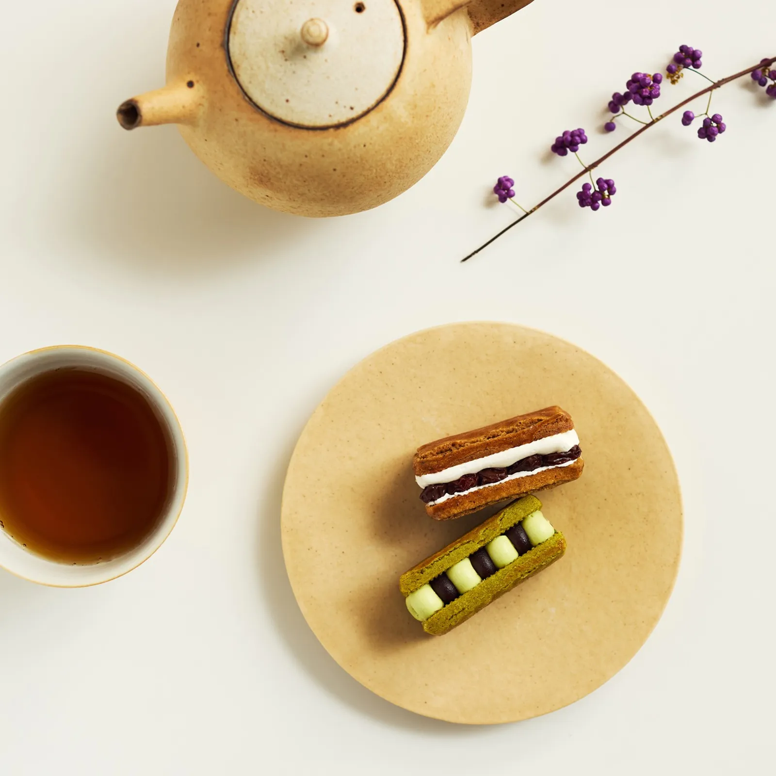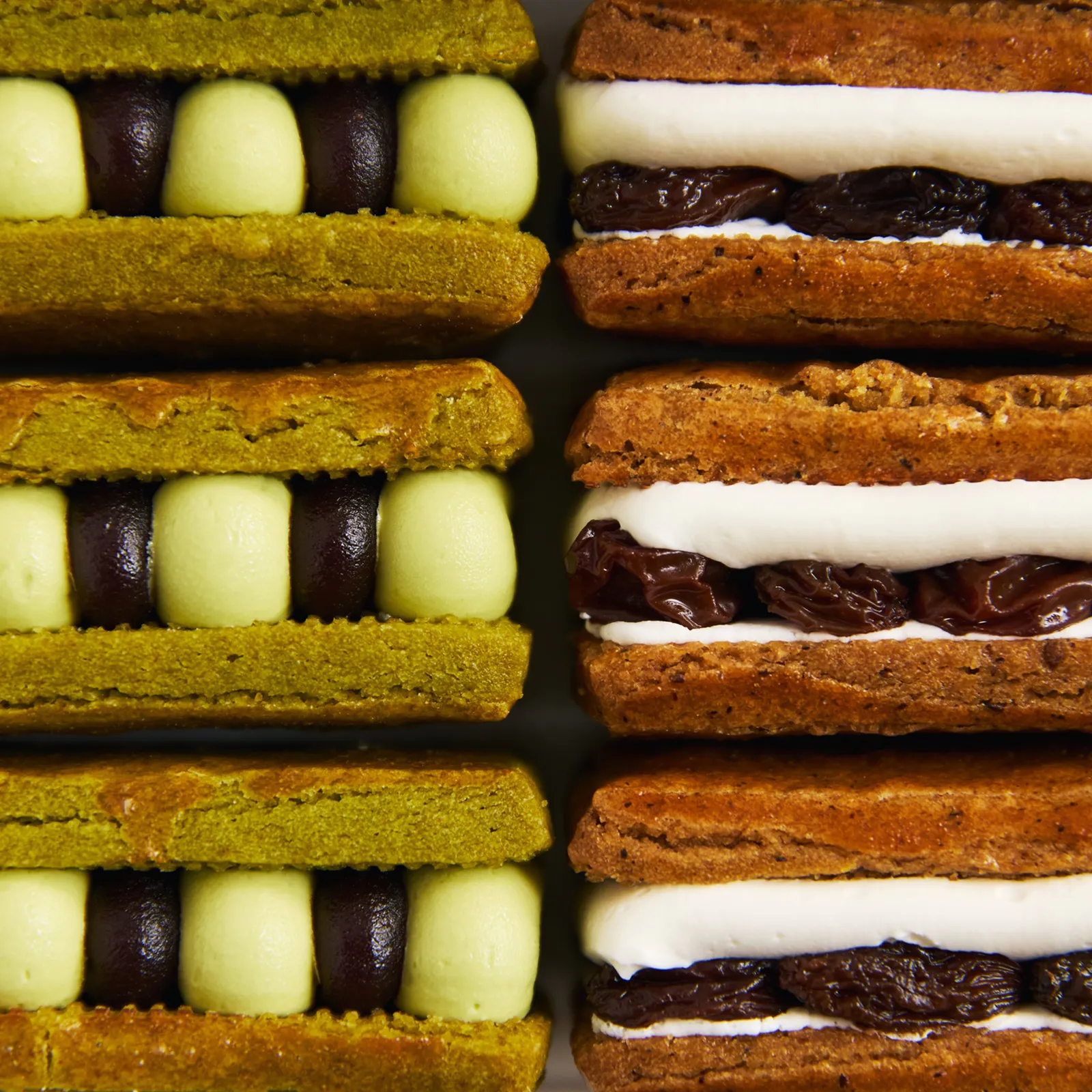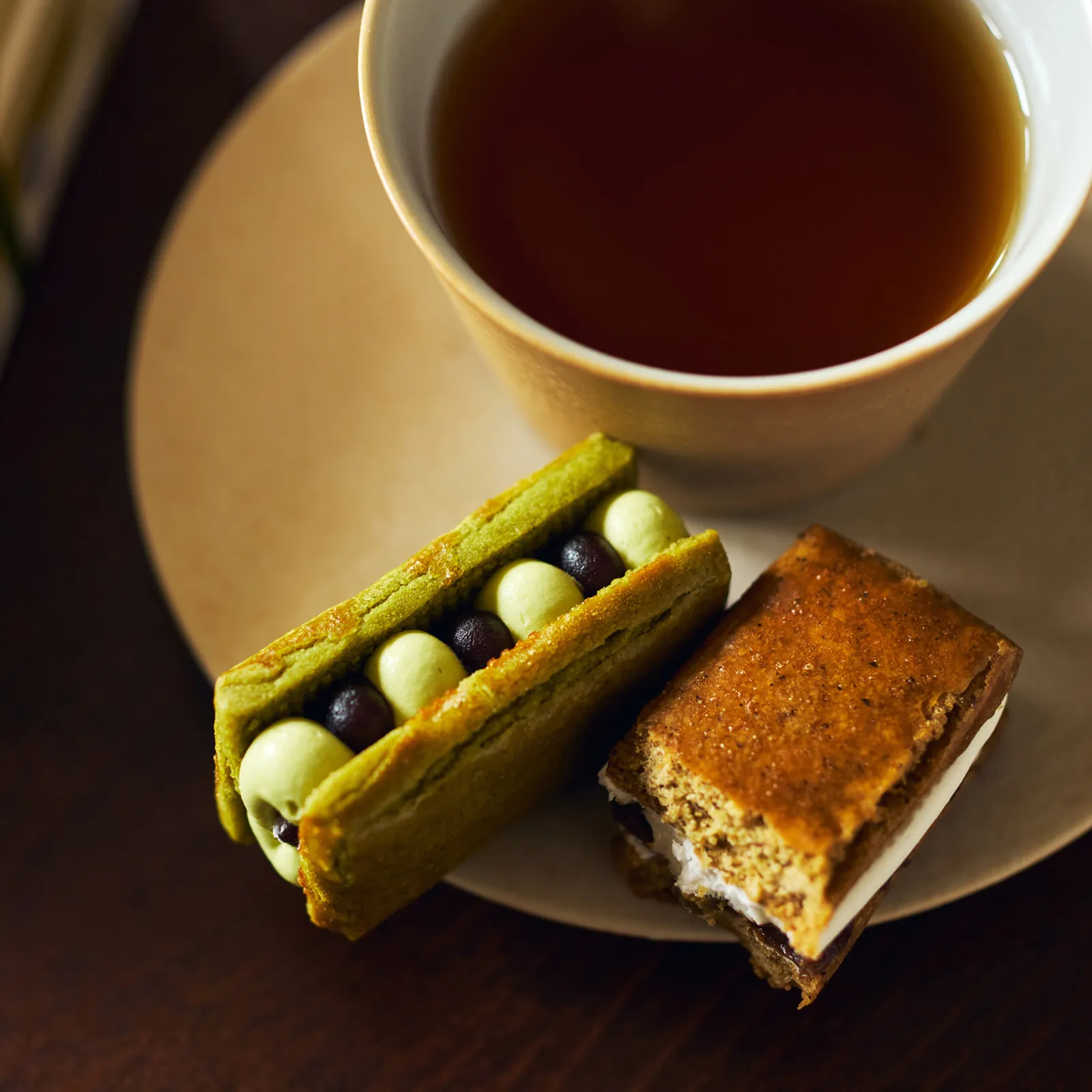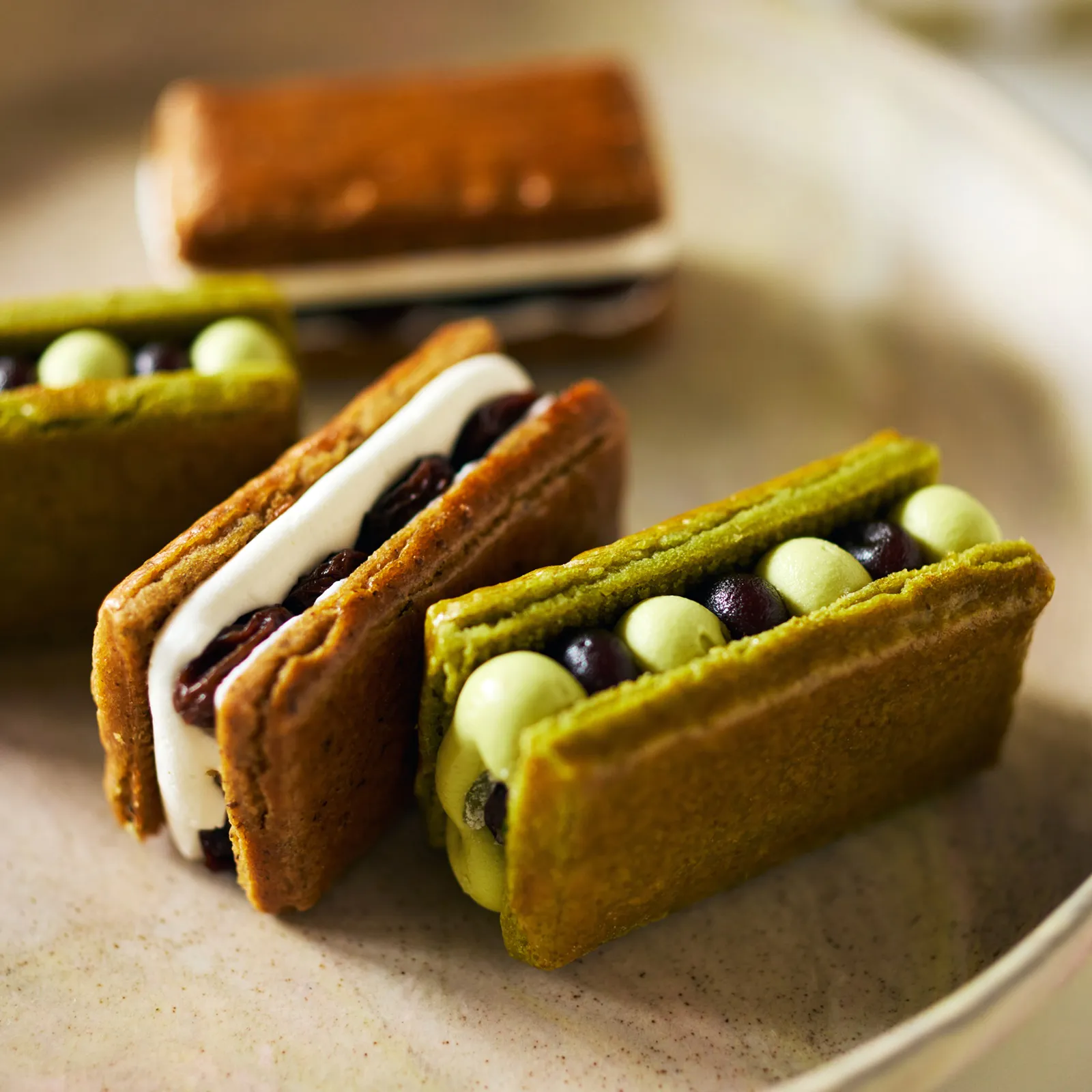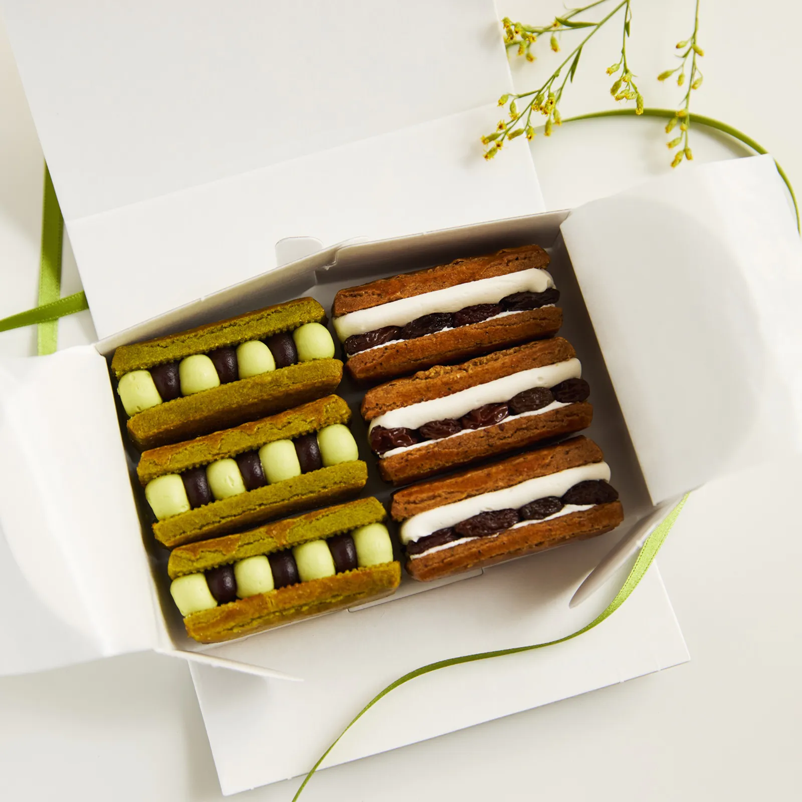 箱の中には抹茶あんサンドとほうじ茶レーズンサンドの2種類が。「抹茶あんサンド」は、抹茶バタークリームに、抹茶ガナッシュを絞り、抹茶の風味でうっとりする世界の中に、<トラヤあんスタンド>のあんペースト[黒砂糖とメープルシロップ]、求肥のもちもち、紀州原農園の樹上完熟レモンで作ったレモンコンフィがキラキラと輝きます。ブランドのシグネチャーであるレーズンサンドに京都らしさを加えた「ほうじ茶レーズンサンド」は、ほうじ茶ミルクジャムを絞り、サブレにもたっぷりとほうじ茶を練り込みました。ほうじ茶の香ばしさとレーズンのジューシーなコントラストをお楽しみください。