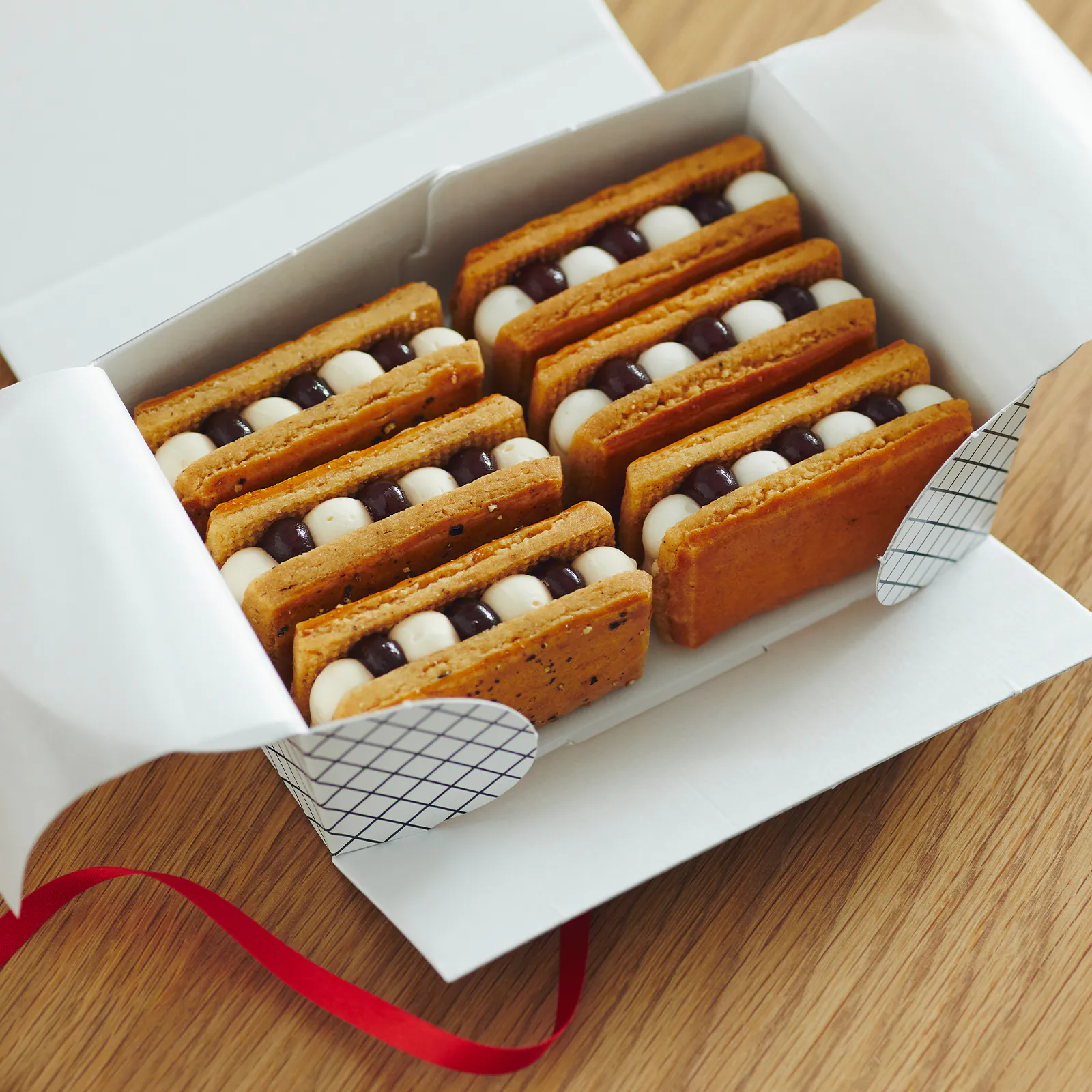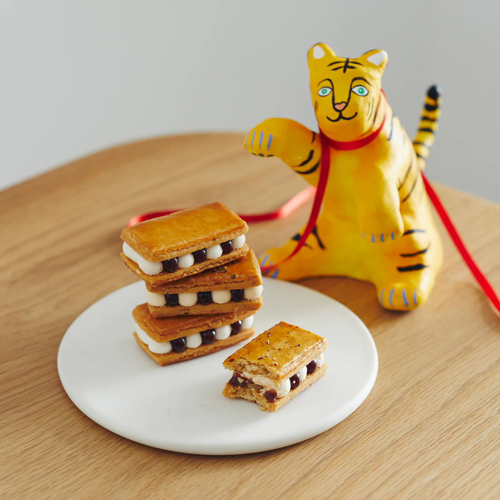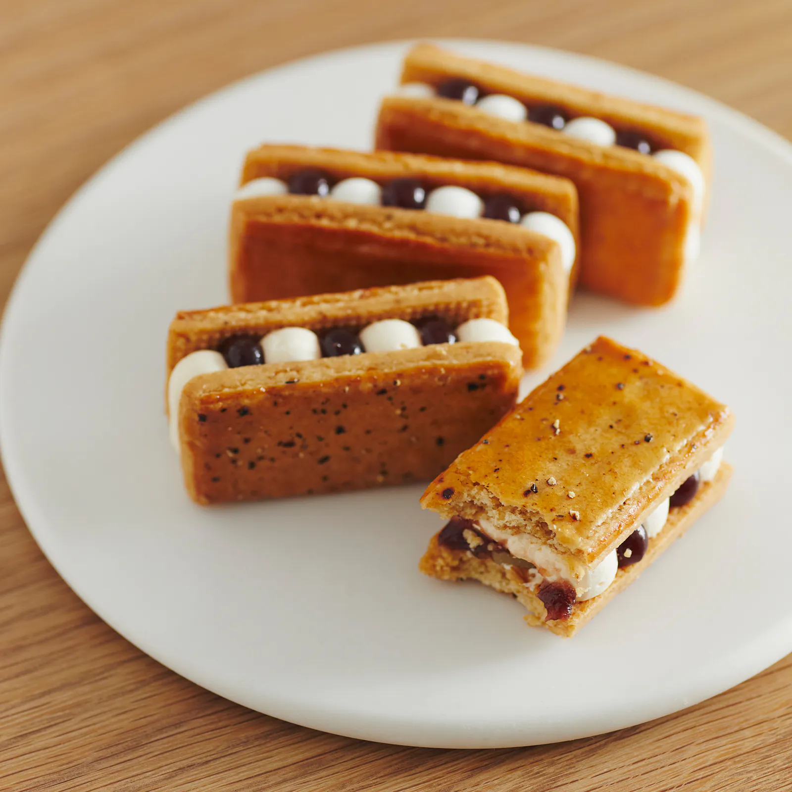 ツヤリと輝くのは二種のあんバターサンド。こしあんバターサンドには、あんみつから着想を得た杏とみかんのジューシーなフィリングをサンド。黒糖あんバターサンドにはくるみを忍ばせ、アクセントに黒胡椒が光ります。あんとバタークリームが溶け合えば新春万福、夢見心地の味わいです。