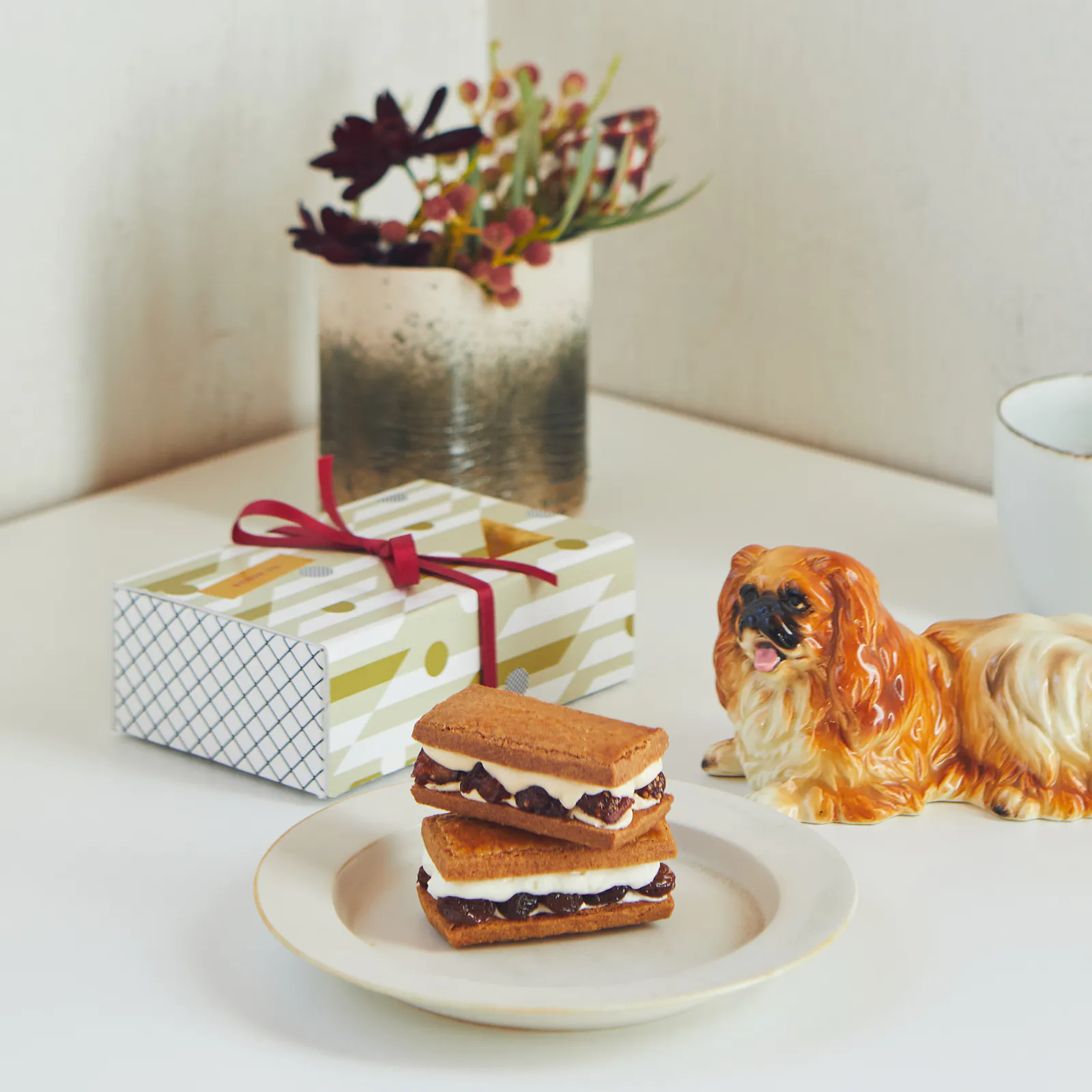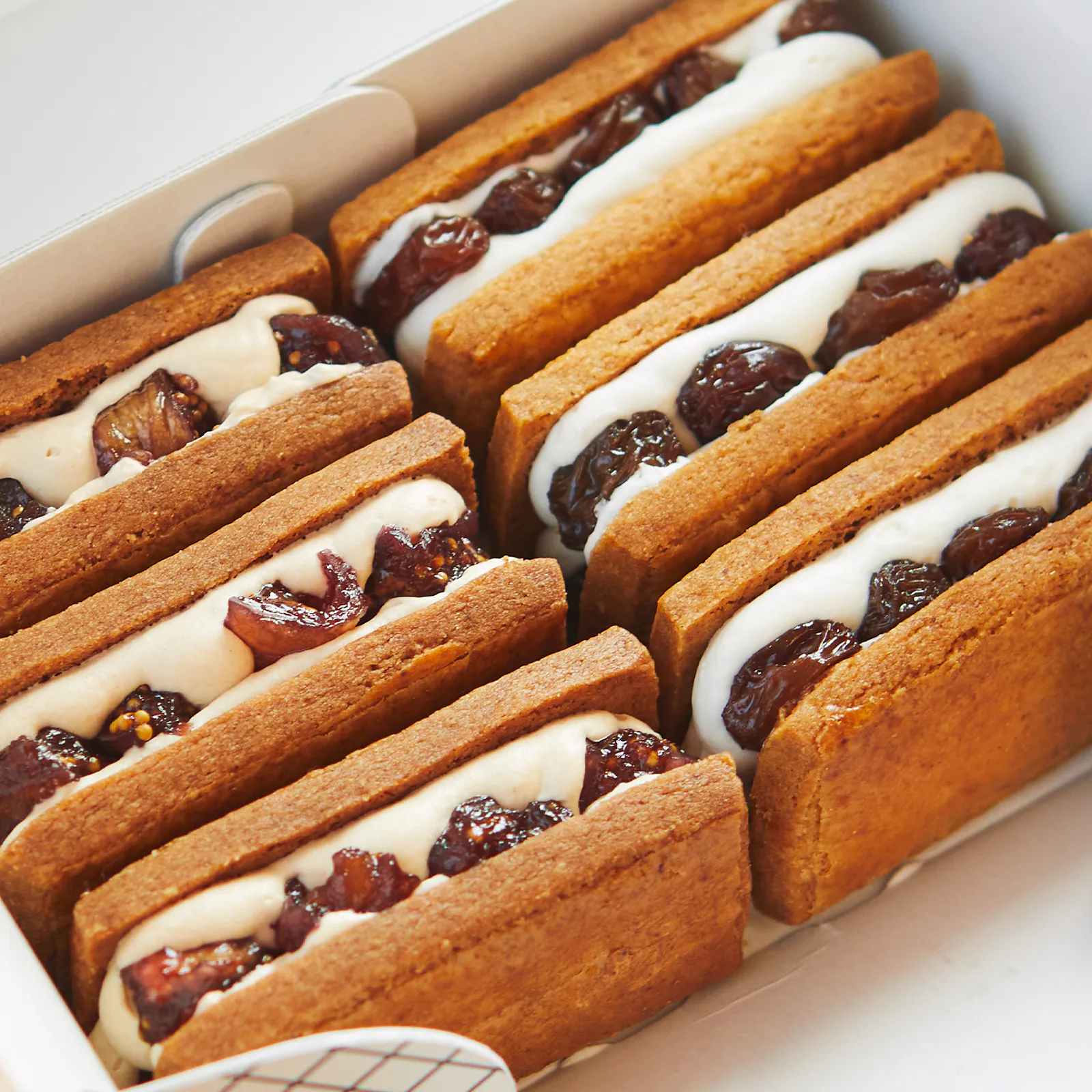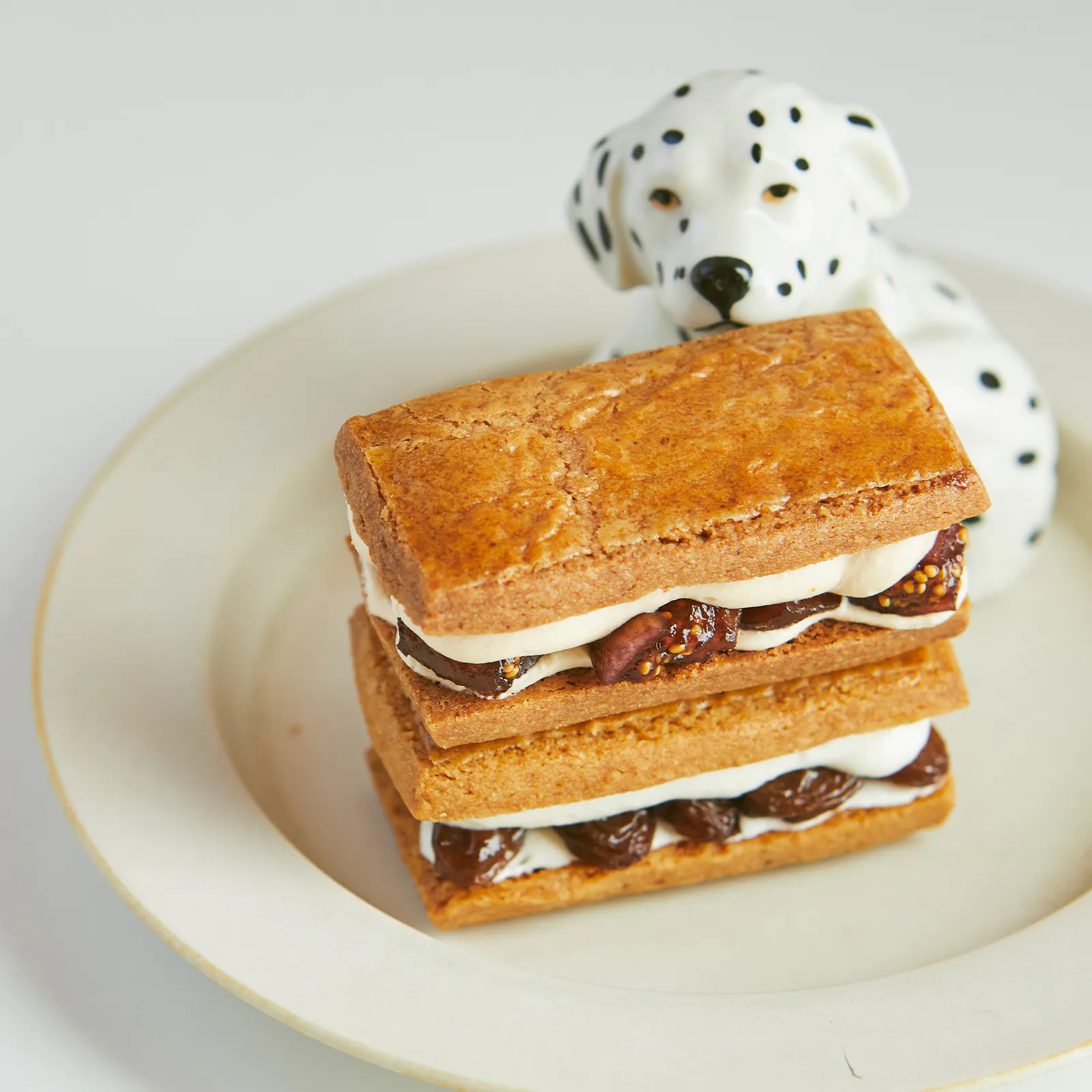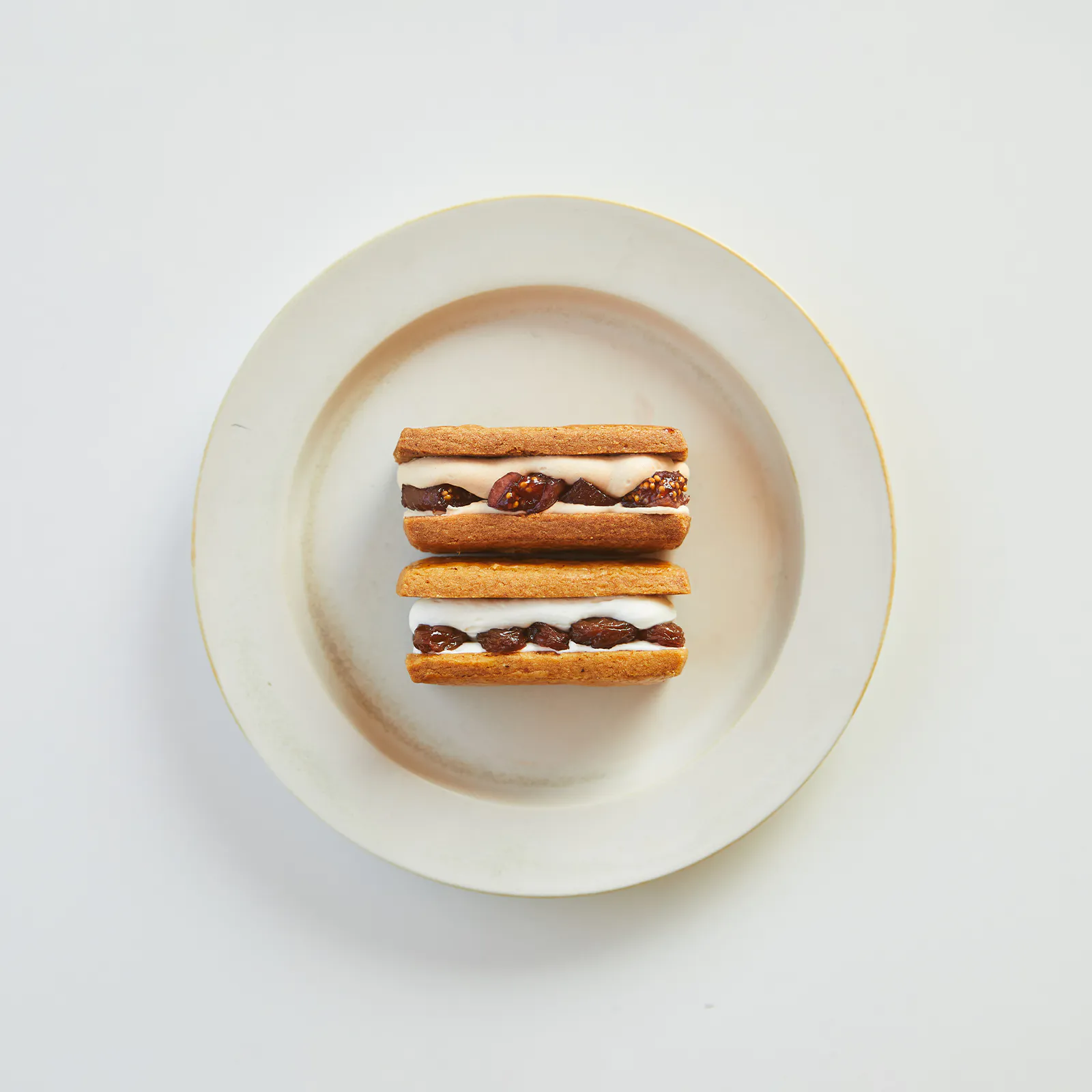 冬の色気たっぷりのスパイスと赤ワインでじっくり煮込んだイチジクを、キャラメル香るバタークリームに乗せ、シナモン入りのふくよかなサブレでサンド。イチジクがプチプチ弾けるたびに心踊る、冬のときめきが詰まったバターサンドです。