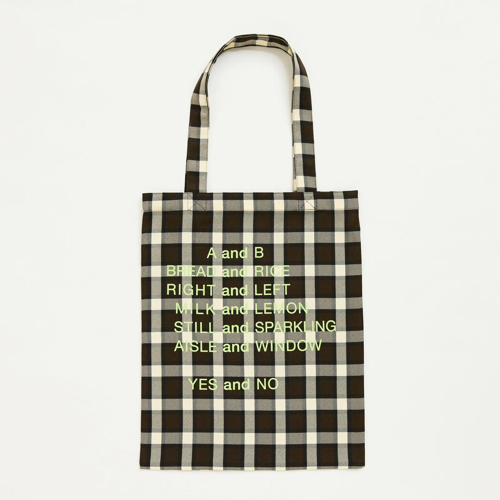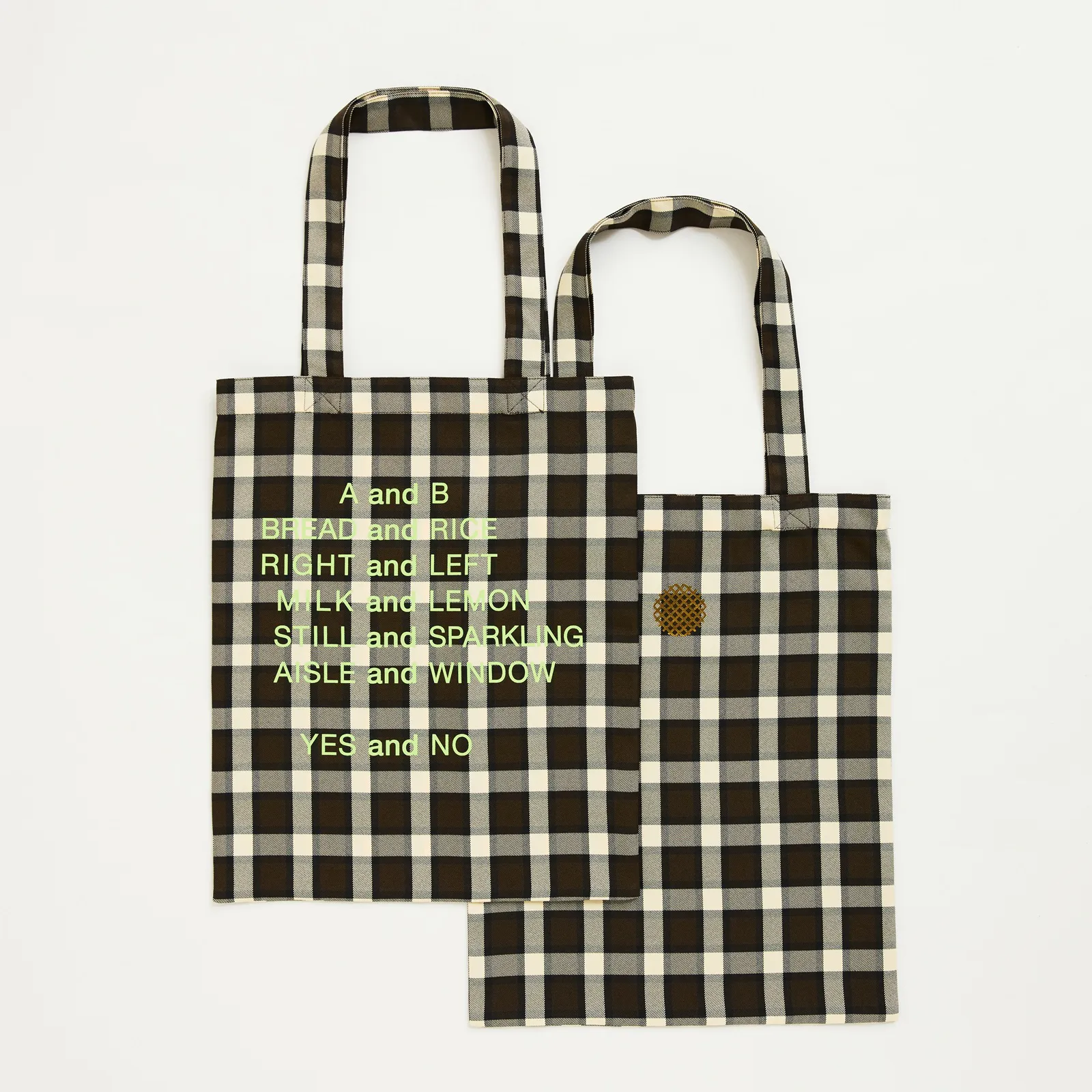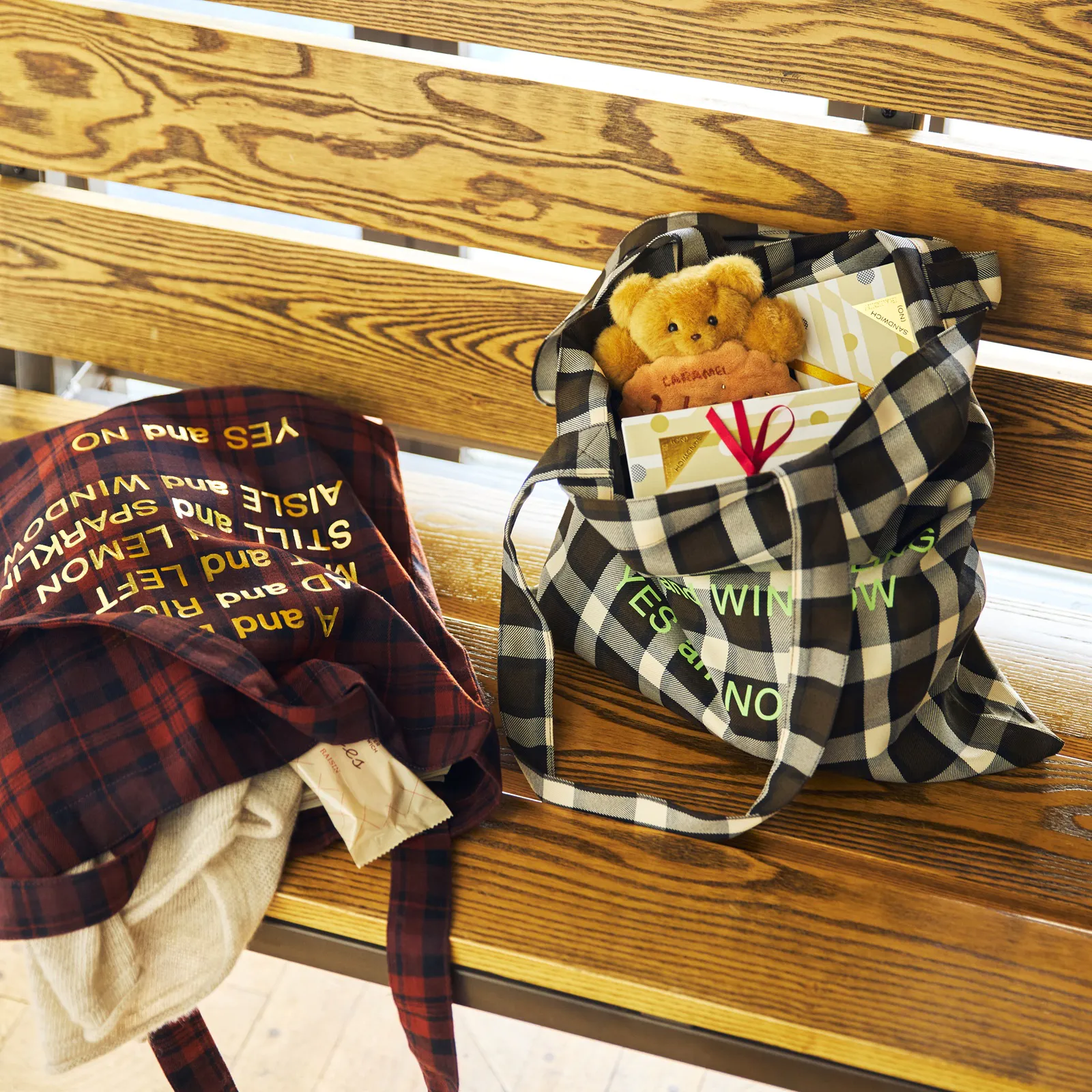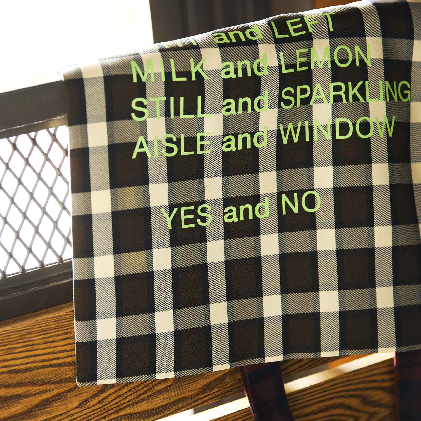 「AISLE or WINDOW(通路側か窓側か)?」。飛行機で聞かれるこの質問は、なにげないようで人生でなにを見てなにを得ていきたいか、という大きなテーマを象徴している気がします。通路側を選ぶのは合理的だし、窓際を選ぶのはロマンチックかもしれません。できることならそのどちらをも持ち併せたAISLE and WINDOWSな精神でやっていきたい。"or"ではなく"and"。そんな思いをこめたトートバッグを作りました。「通路側か窓際か?」はもちろん、「ごはんかパンか?」「レモンかミルクか?」など、どちらか選ばなきゃいけない"or"な言葉を"and"で結んだ、YES and NOなノーレーズンサンドらしいトートバッグです。
