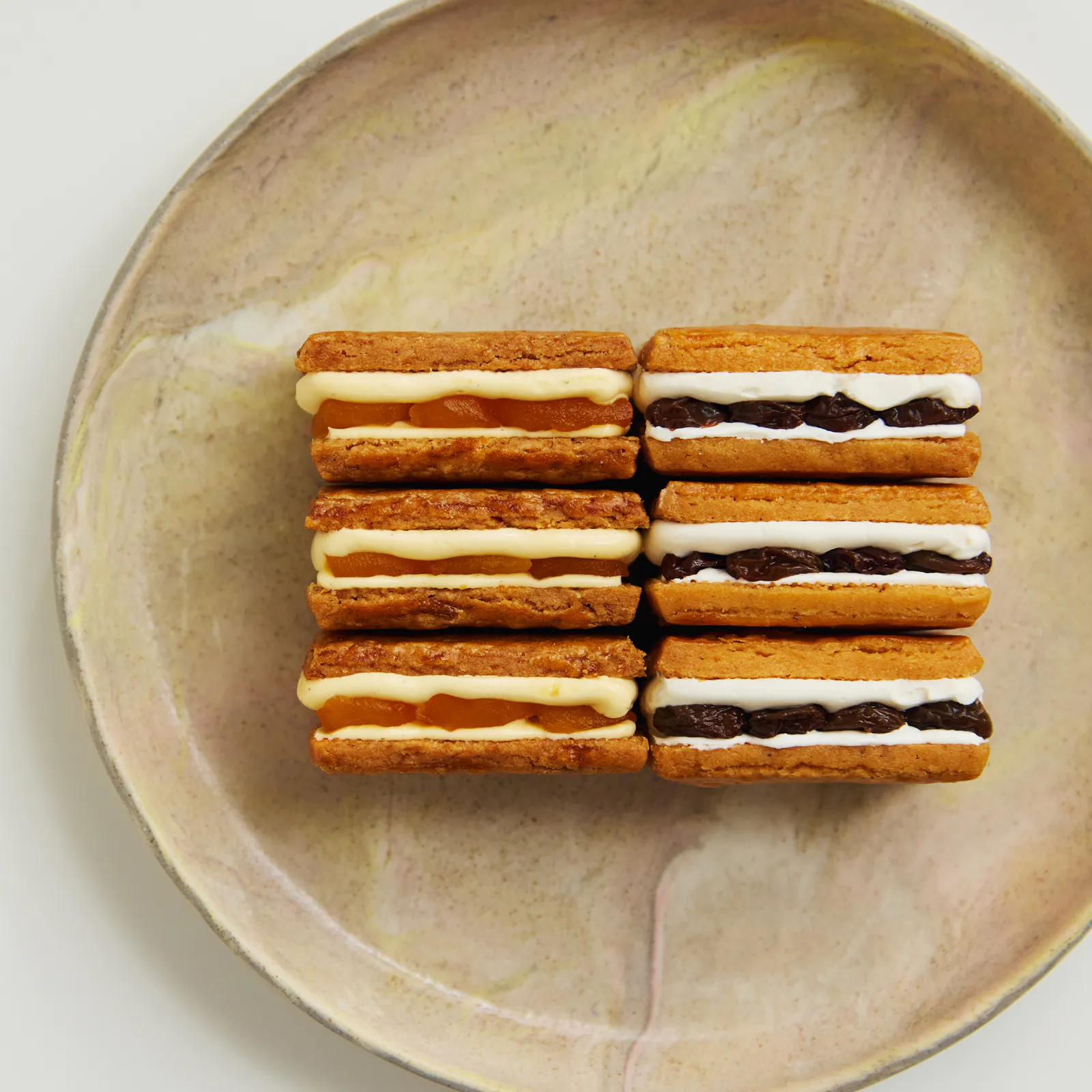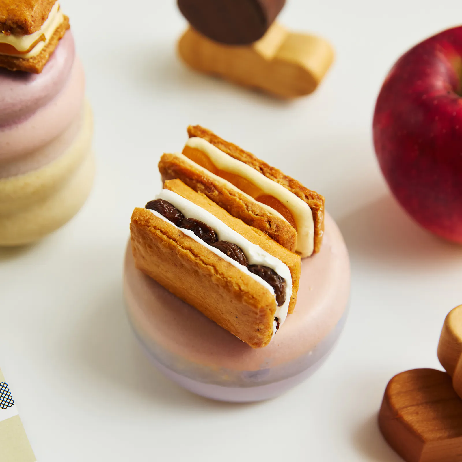 シナモンやクローブの香りが漂ようサブレは、フィヤンティーヌを混ぜ込むことでザクザクなパイを表現。バタークリームには、カスタードとサワークリームを加え、キャラメルでコンポートした林檎はシャキシャキ感を残して仕上げ、香ばしいピーカンナッツと挟みました。アップルパイを頬張る多幸感をギュッと閉じ込めて、お茶時間を彩ります。