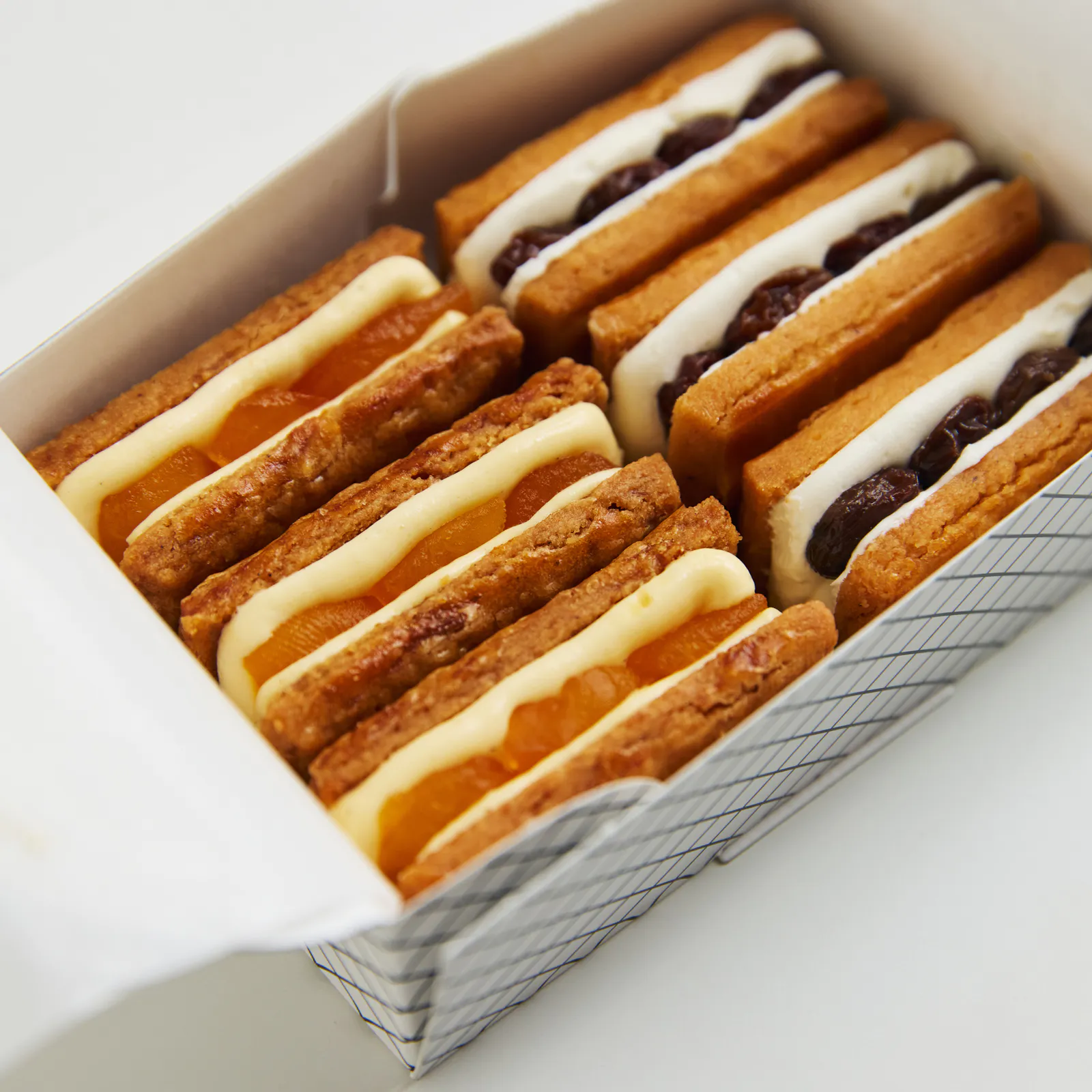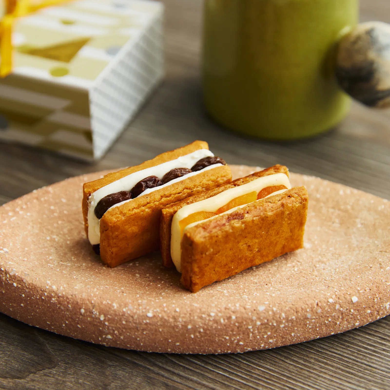 - 〈レーズンサンド〉小麦粉(国内製造)、レーズン、砂糖、発酵バター、バター、液卵、卵白、アーモンド、カカオバター、卵黄、洋酒、葡萄酢、ナツメグ、バニラペースト、塩/膨張剤、(一部に小麦・卵・乳成分・アーモンドを含む) 〈アップルパイサンド〉小麦粉(国内製造)、ドライりんご、発酵バター、砂糖、バター、卵黄、アーモンド、クレープフレーク、液卵、ピーカンナッツ、牛乳、カカオバター、サワークリーム、りんご果汁、卵白、洋酒、シナモン、はちみつ、ホワイトチョコレート、バニラペースト、クローブ、塩 /膨張剤